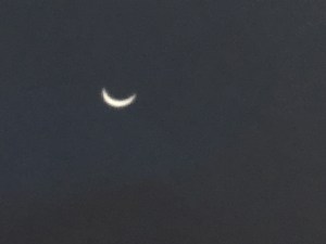 2. we used a pair of bird watching binoculars, held in hand to let the light shine through onto a piece of white paper clipped to a clip board. it was a very sharp image! we could even see the clouds passing over. I was bummed that it didn’t get as dark as I expected (I’m in central Indiana, US), just looked/felt like a storm was coming in. the shadows through the leaves on the trees were trippy, though 🙂
