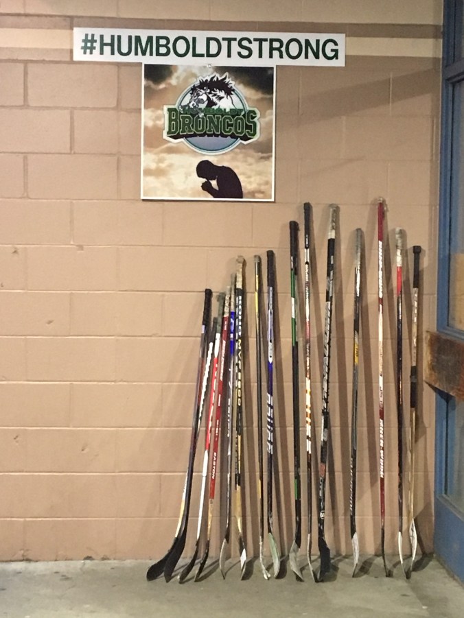 At my younger son’s ball hockey game, everyone stood for a minute of silence and a row of sticks was left outside the door, underneath the hashtag #HUMBOLDTSTRONG.