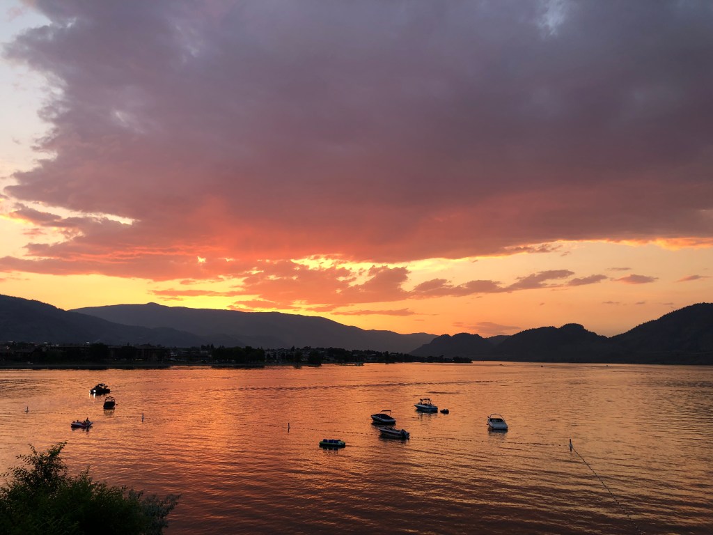 The first night sunset was spectacular. Beautiful, but possibly partly due to the smoke particles in the air from the large number of wildfires in the province already. It’s very early in the season, but the recovery from the extremely hot temperatures has caused lightening strikes, and the hot, dry conditions have made anything human-caused hard to control. There are over 200 active wildfires in the province right now, with 750 so far this year. The number of hectares of land that have burned to date is already more than burned in all of 2019 and 2020 combined and more than three times the 10-year average for early July. Sunday and Monday we could smell a bit of smoke, but it cleared up yesterday. Today has been heavy rain, which will help the situation. (I don’t mind too much… still on vacation and doing vacation-type things.)