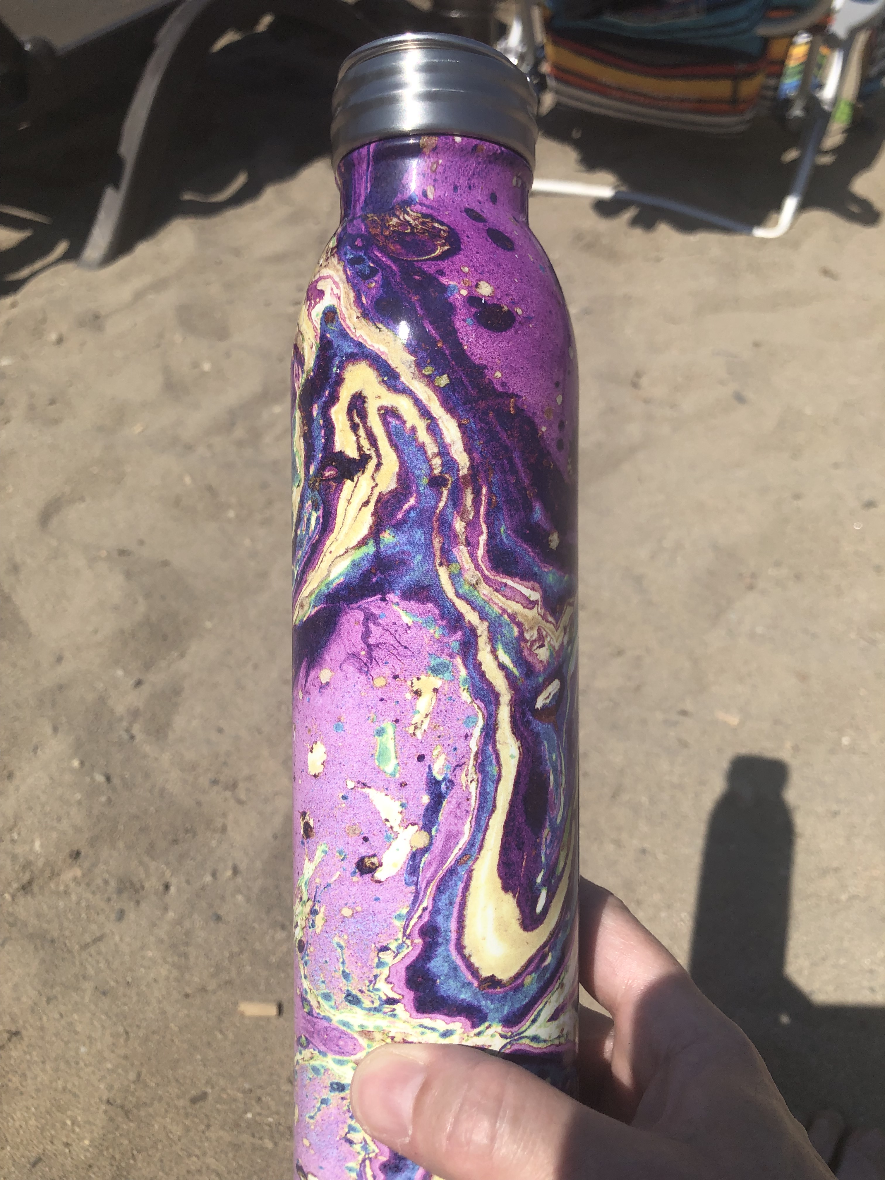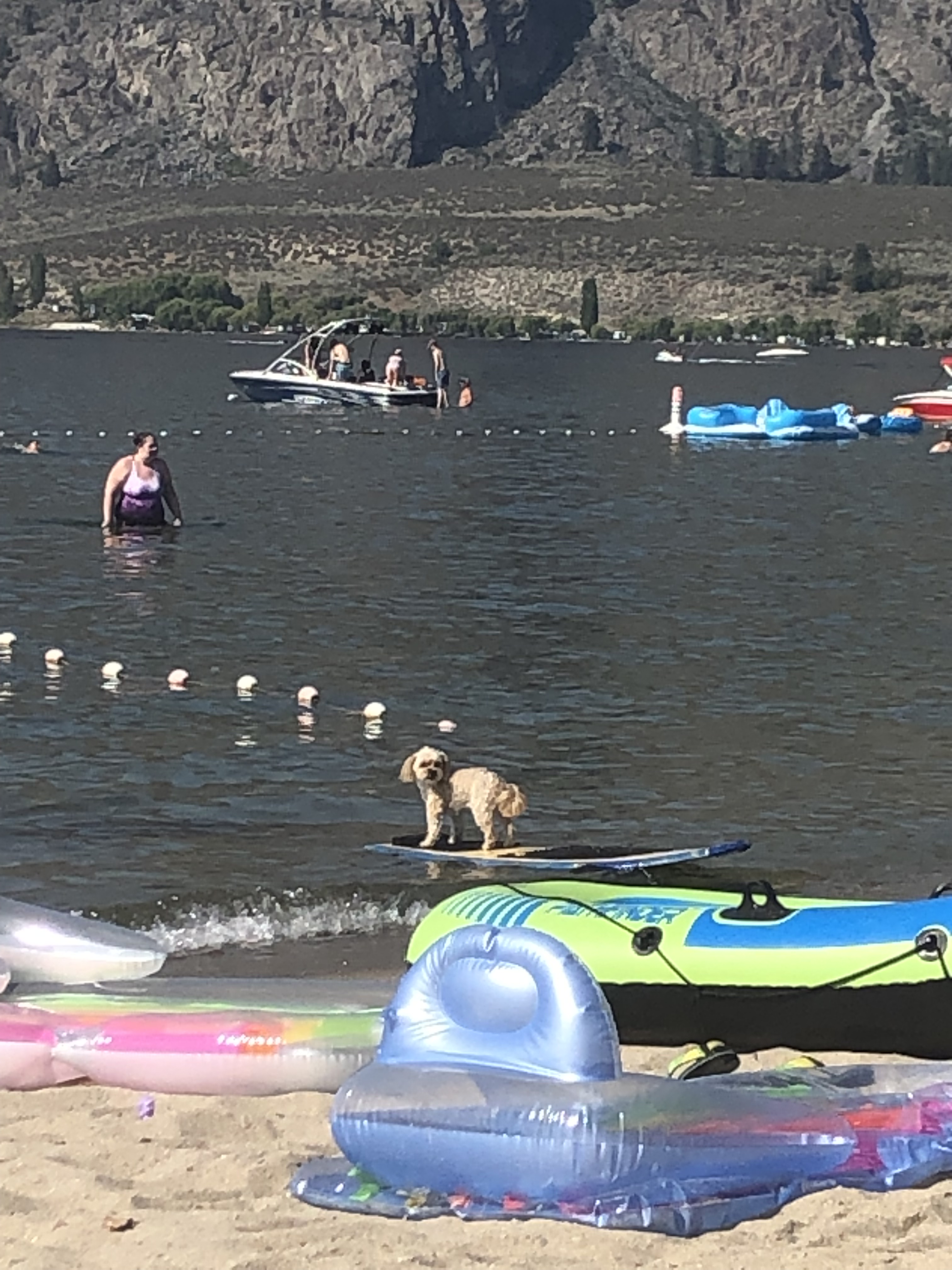 Tuesday, was a day in the sun. Very relaxing. A quote in the beach book I was reading (How Lulu Lost Her Mind by Rachel Gibson) summed it up perfectly: “There is a stillness…, a quiet that allows my heart to beat without worry and calms my mind. My head is clearer and I can think about moving forward.” The temperature was around 35 degrees Celsius (95 F), but a dry heat alleviated with quick dips in the lake as necessary. Trevor had a good time too, sunning himself on the towel! As did the little dog on the skim board! The day before, at Tinhorn Creek, I bought this fabulous water bottle. It keeps the water icy cold even in 35-degree heat, is dishwasher safe, and the colours just make me happy!