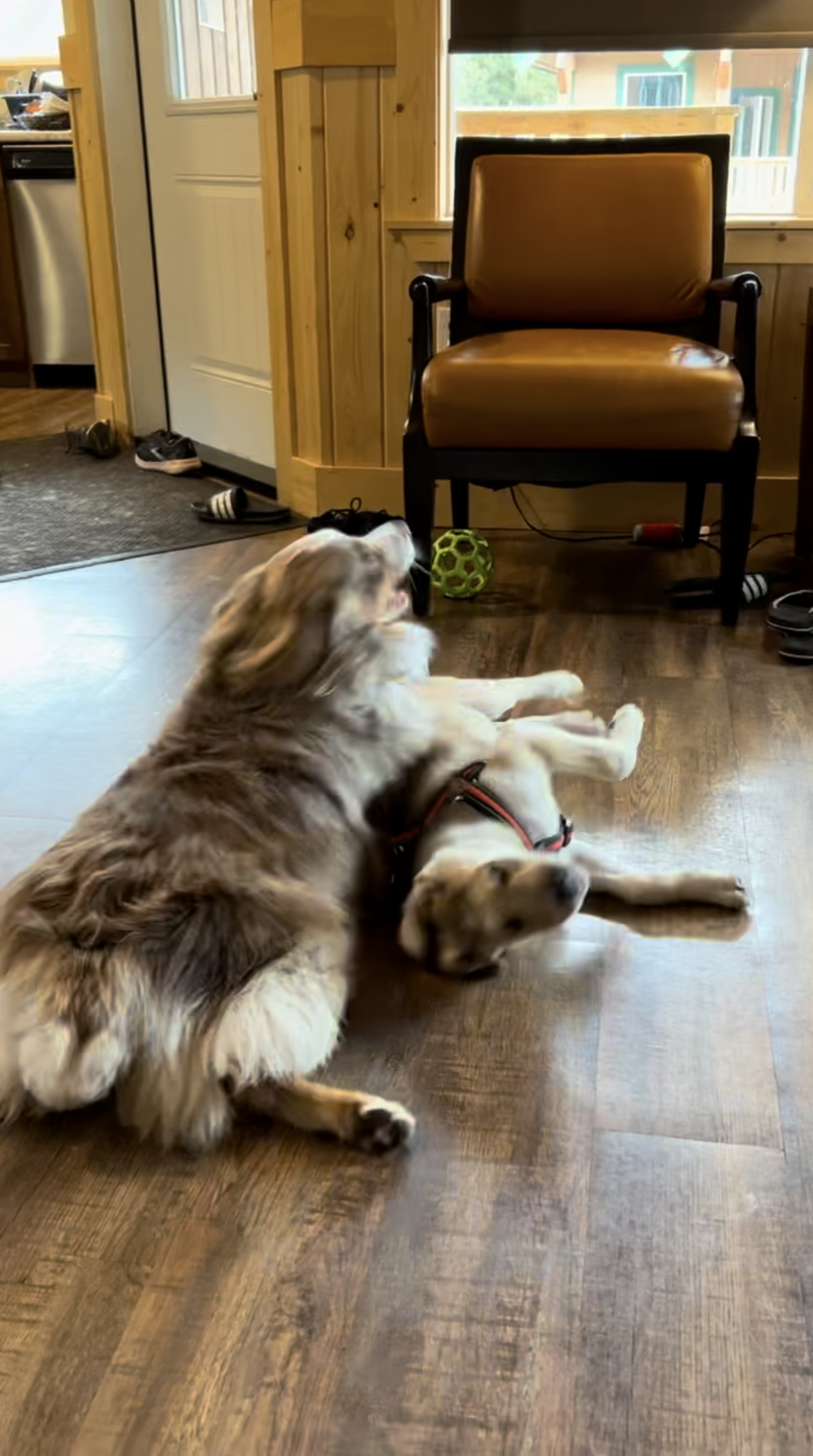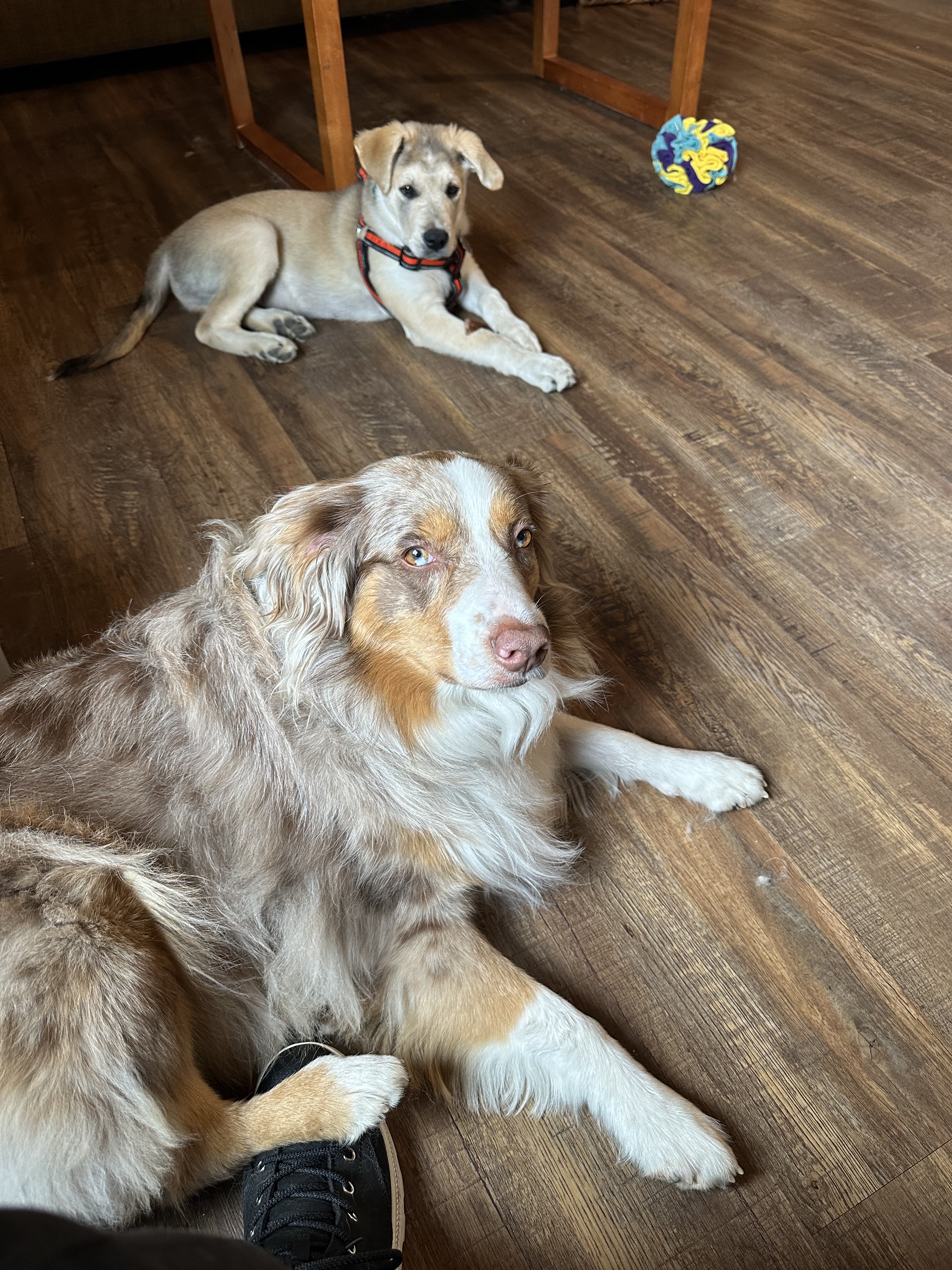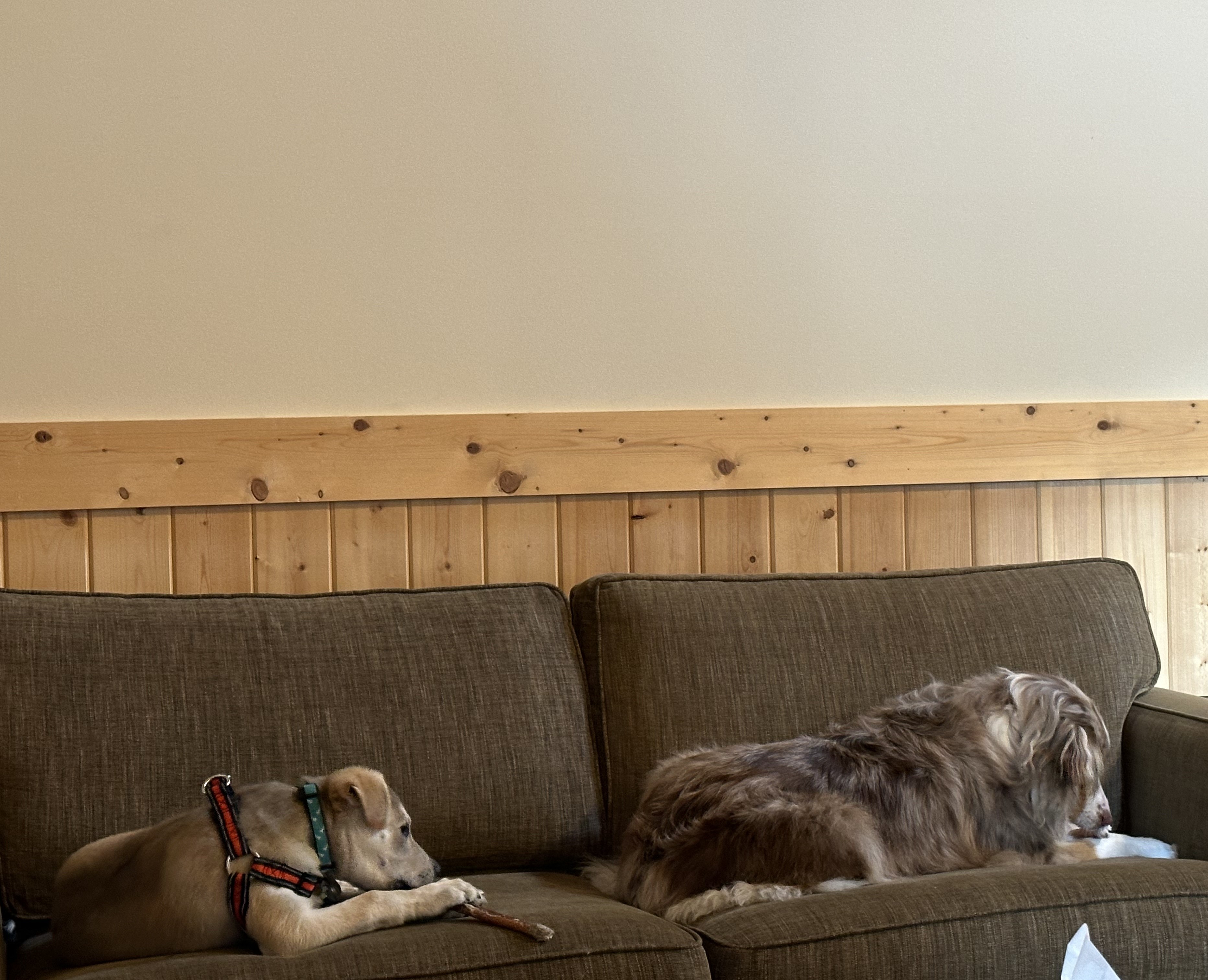 This is a full family affair, with both adult sons and the older son’s girlfriend/partner. Rounding out the party are their 12-week-old puppy (a lab/husky mix) and our nearly 3-year-old Australian Shepherd. It’s a quiet vacation, except when the dogs are rough-housing on the floor and fighting for the same bully-stick… it doesn’t matter how many sticks are on the floor, the best one is the one the other dog is chewing on! Our dog is very socialized with other dogs as she goes to doggie daycare a couple of times per week. She is teaching her puppy “nephew” to play without hurting. And he is giving her some good exercise and stimulation. There are also lots of trails here and opportunities for good long walks — yesterday’s was three hours around the lake! (No, not me.)